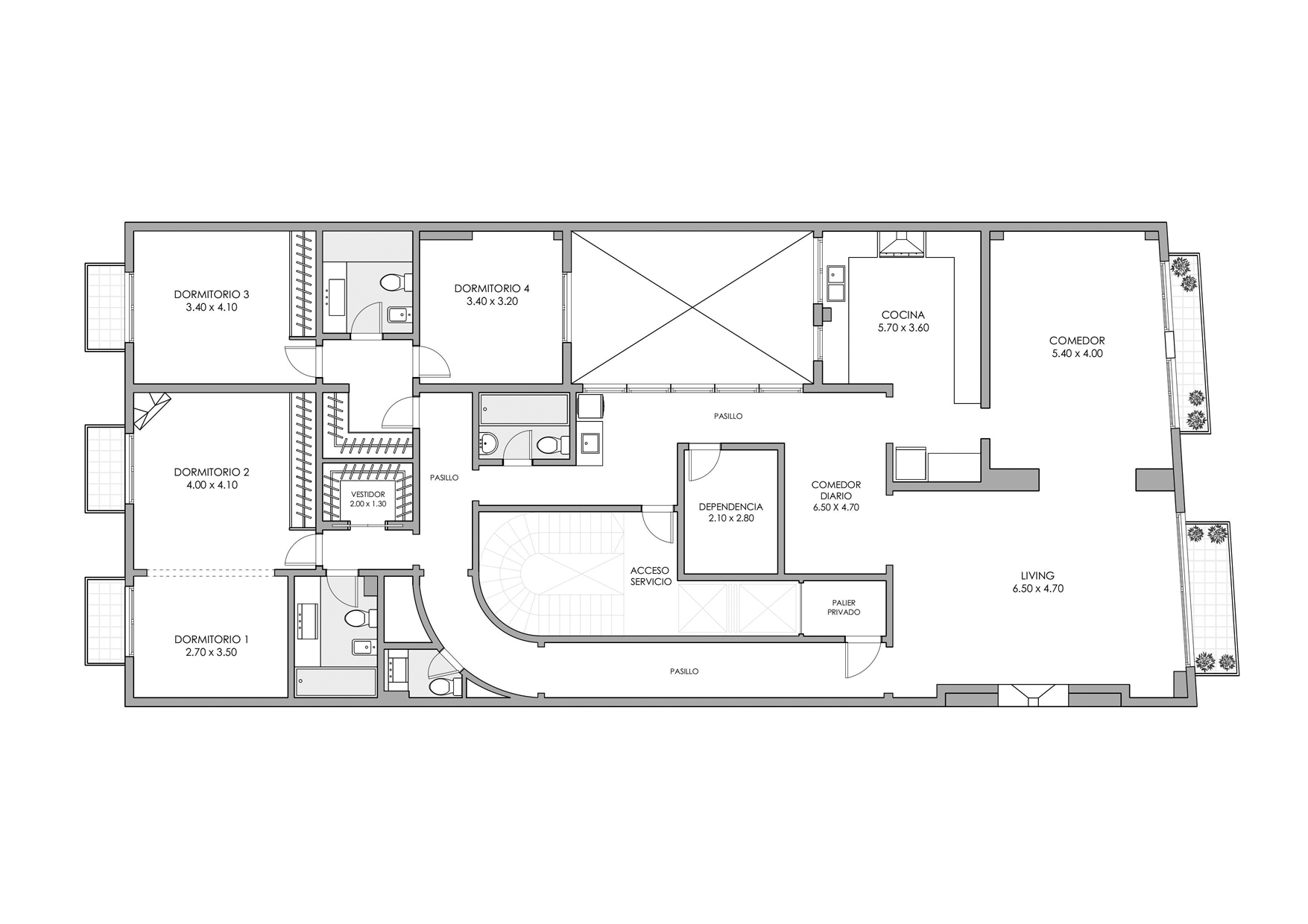 – Tres dormitorios amplios, incluyendo suite principal con vestidor. Dos al contrafrente y uno al aireluz. Posibilidad de generar un cuarto dormitorio.
